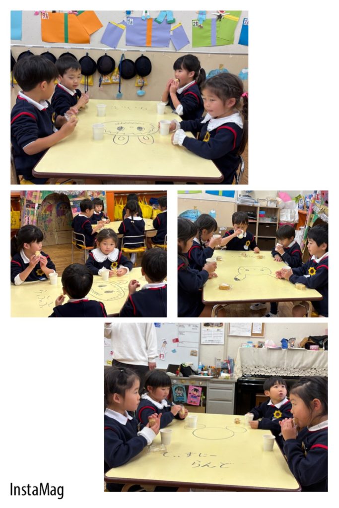 幼稚園に帰ってくると、あっこ先生と佐藤先生があたたかいココアとバウムクーヘンをどうぞ♪・・・と![]()