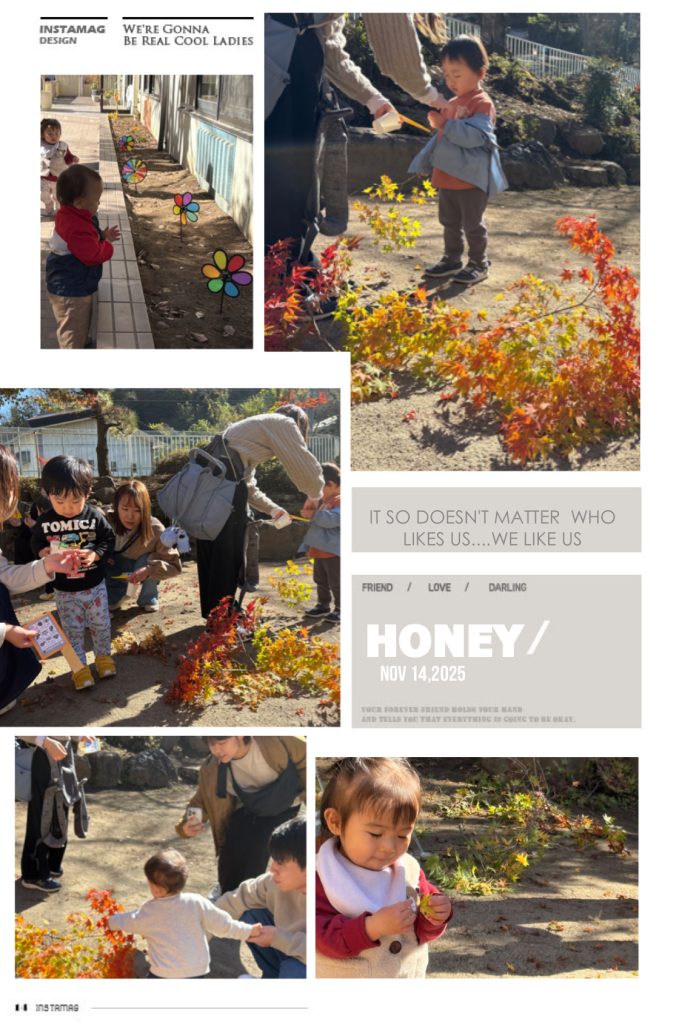 園庭の紅葉もきれいに色づいて、子どもたちのほっぺたをきらきらと照らしています![]()