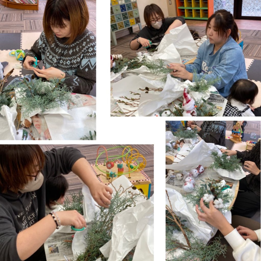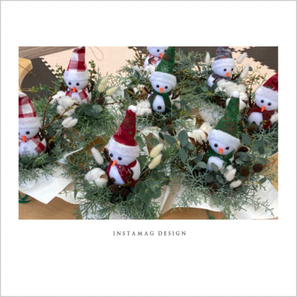雪だるまのマフラーや帽子の色、表情がひとつひとつ違って、とってもかわいいクリスマスアレンジメントが出来上がりました![]()