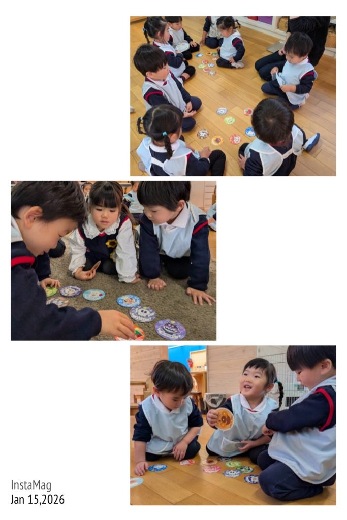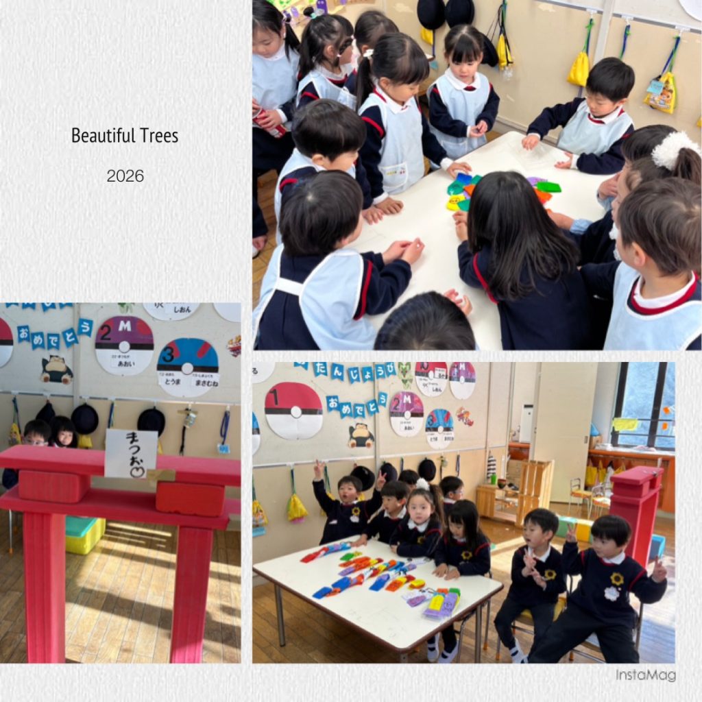 もも2くみさんは、初詣に行った子どもたちが多く、みんなで考えたありがたい神社「まつお神社」で手作りのお守りを桃・青組さんに売って遊んでいます。名前の由来は何でしょう・・・?みんなが神様だそうですよ☆